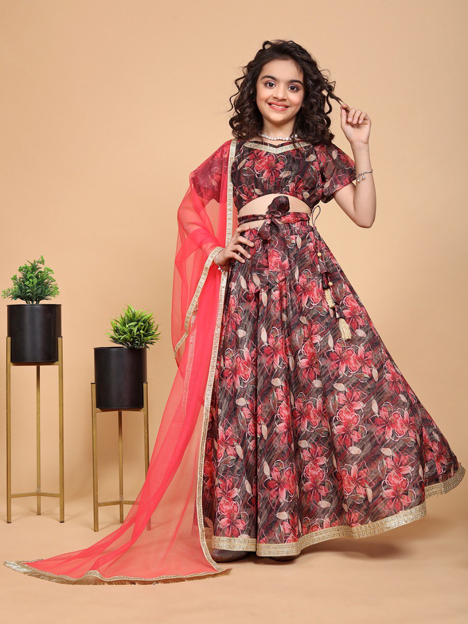 Elira Maroon Printed Girls Lehenga Choli Set