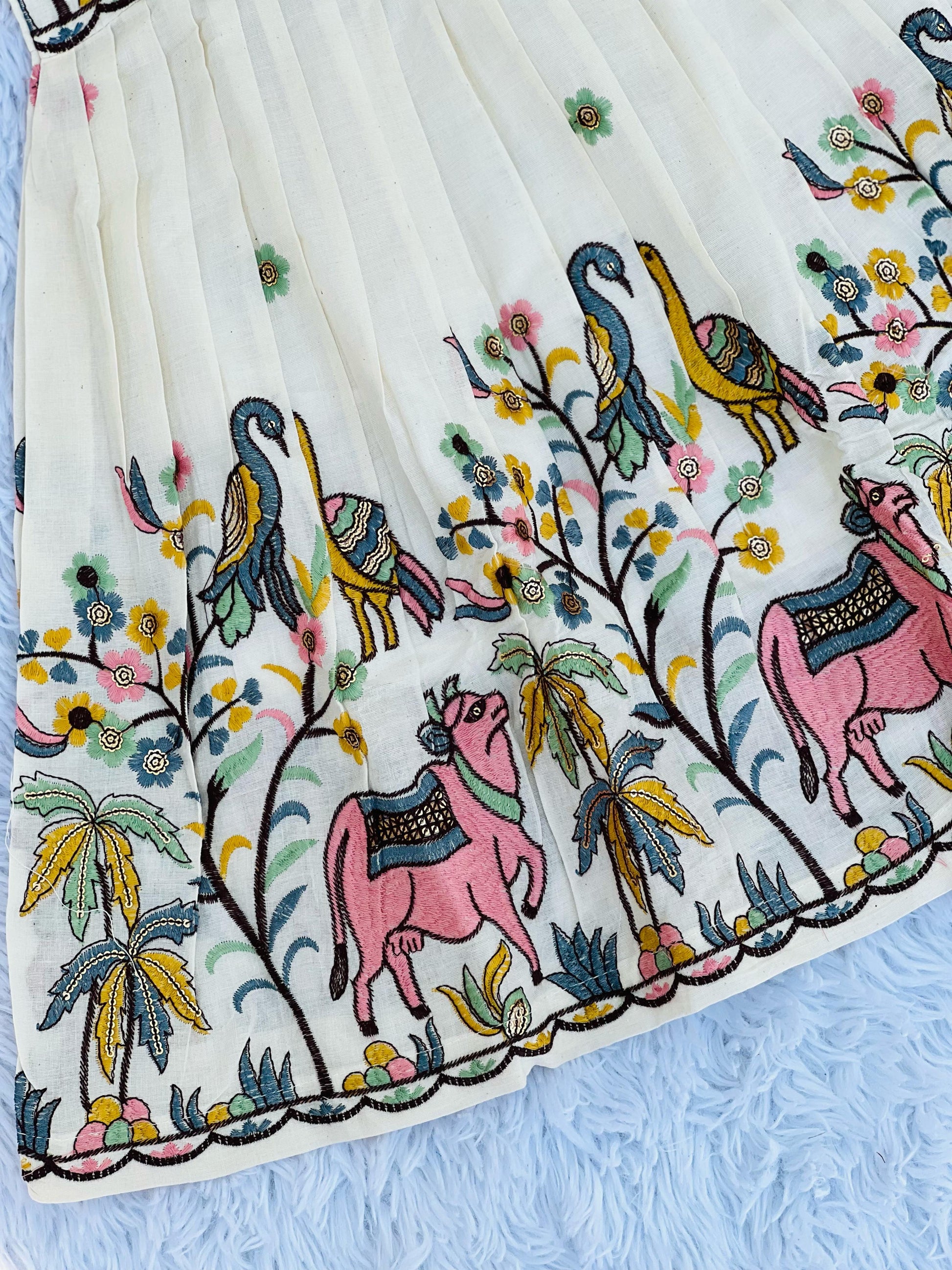 - Flamingo Embroidery Work on Khadi Cotton Fabric Kids Frock